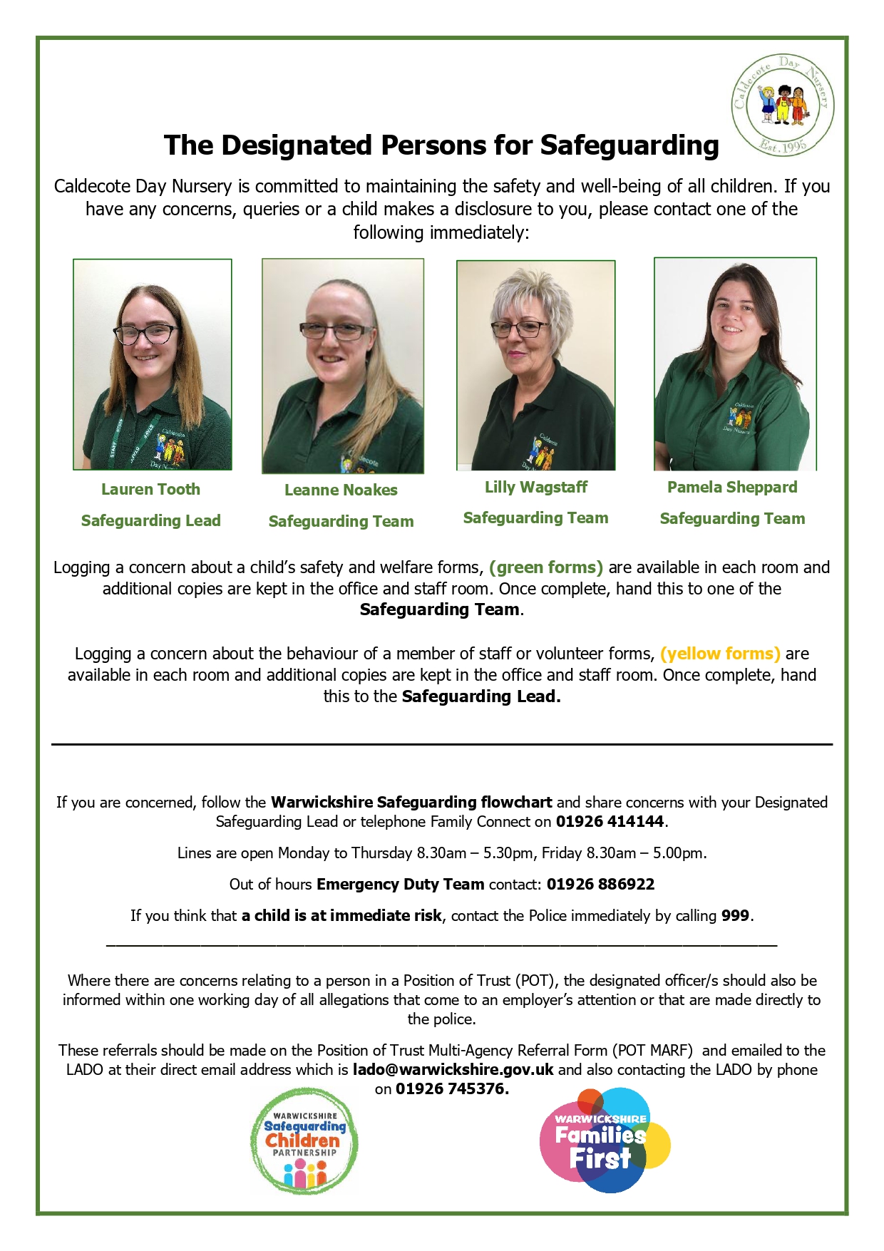 We all have a responsibility to keep children safe. Our DSL Team (Designated Safeguarding Leads) have additional responsibilities in ensuring the safety and well being of children and young people involved in nursery.